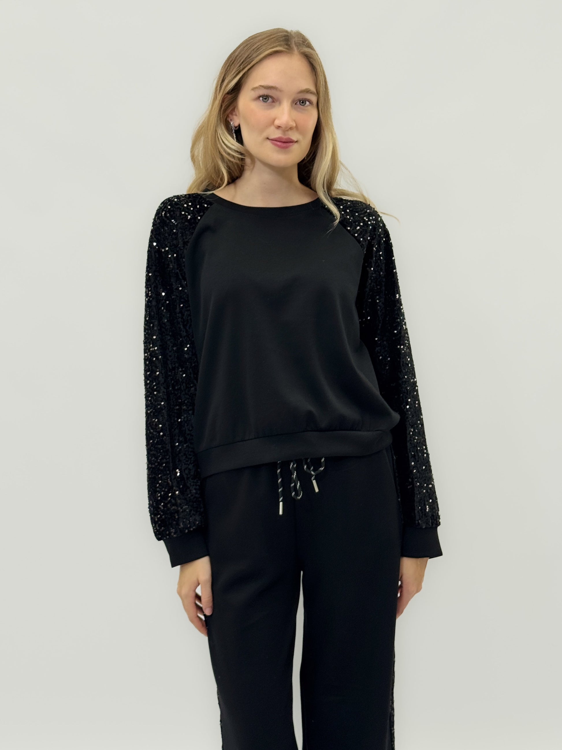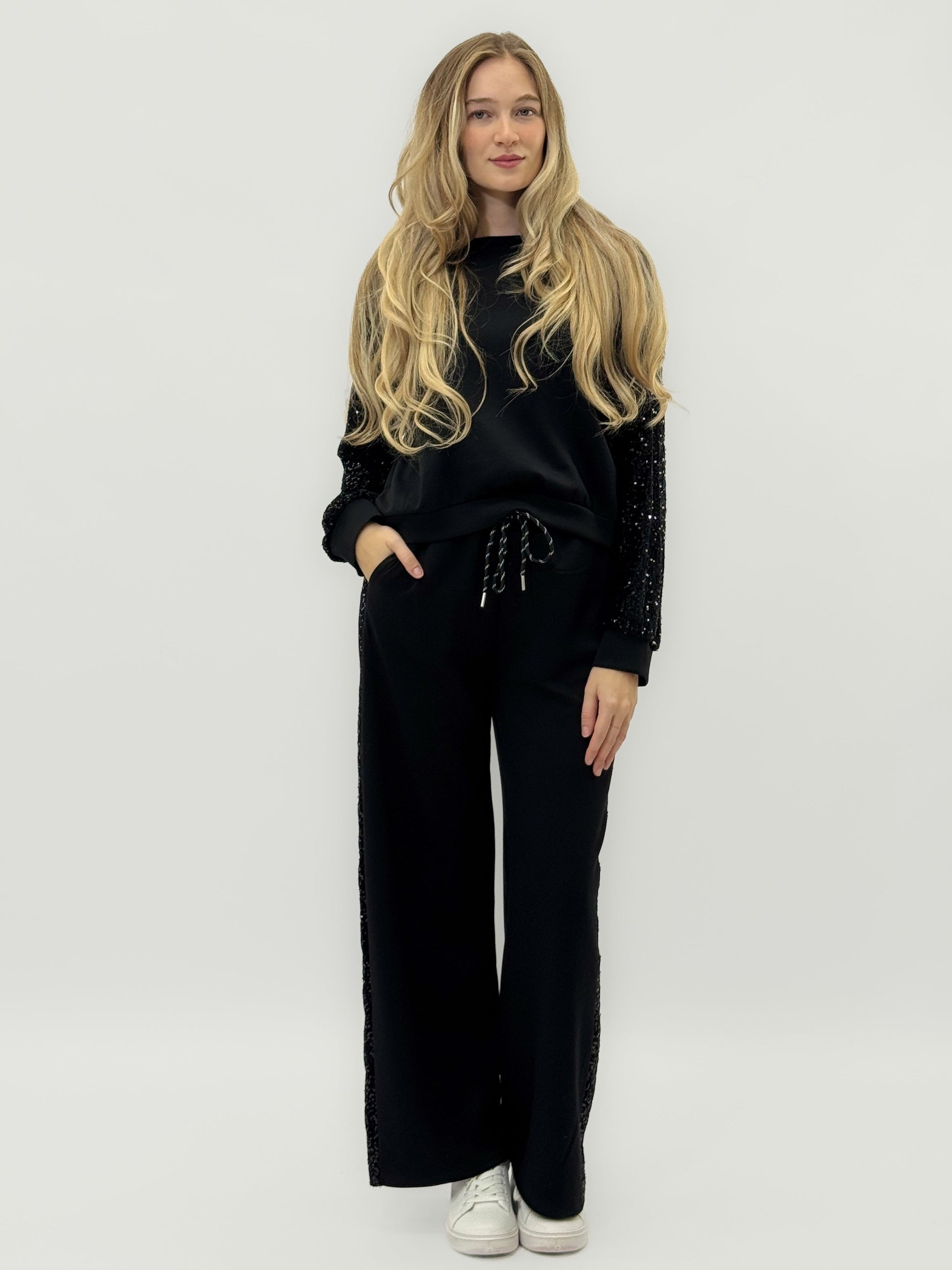 Raffiné mais confortable, ce complet avec des détails en sequins allie élégance et confort dans un seul look. Le modèle présente un sweat-shirt à manches longues avec des épaules légèrement tombantes et des inserts de sequins ton sur ton sur les manches, parfaits pour apporter de la lumière et une touche glam.