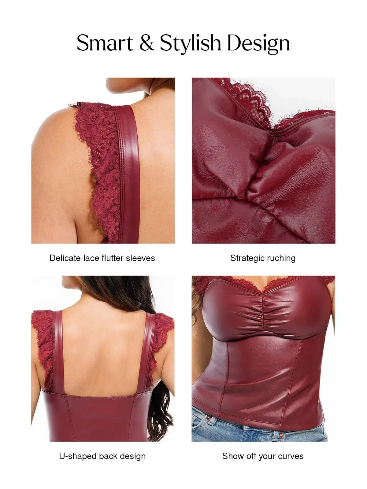 Des manches en dentelle délicate adoucissent les épaules, tandis que la dentelle au bord des bonnets ajoute une touche d'allure. Les coutures princesses créent une silhouette amincissante, et la longueur cropped allonge visuellement les jambes. Un ruché stratégique au niveau de la poitrine met en valeur les courbes naturelles avec un léger soulèvement.
