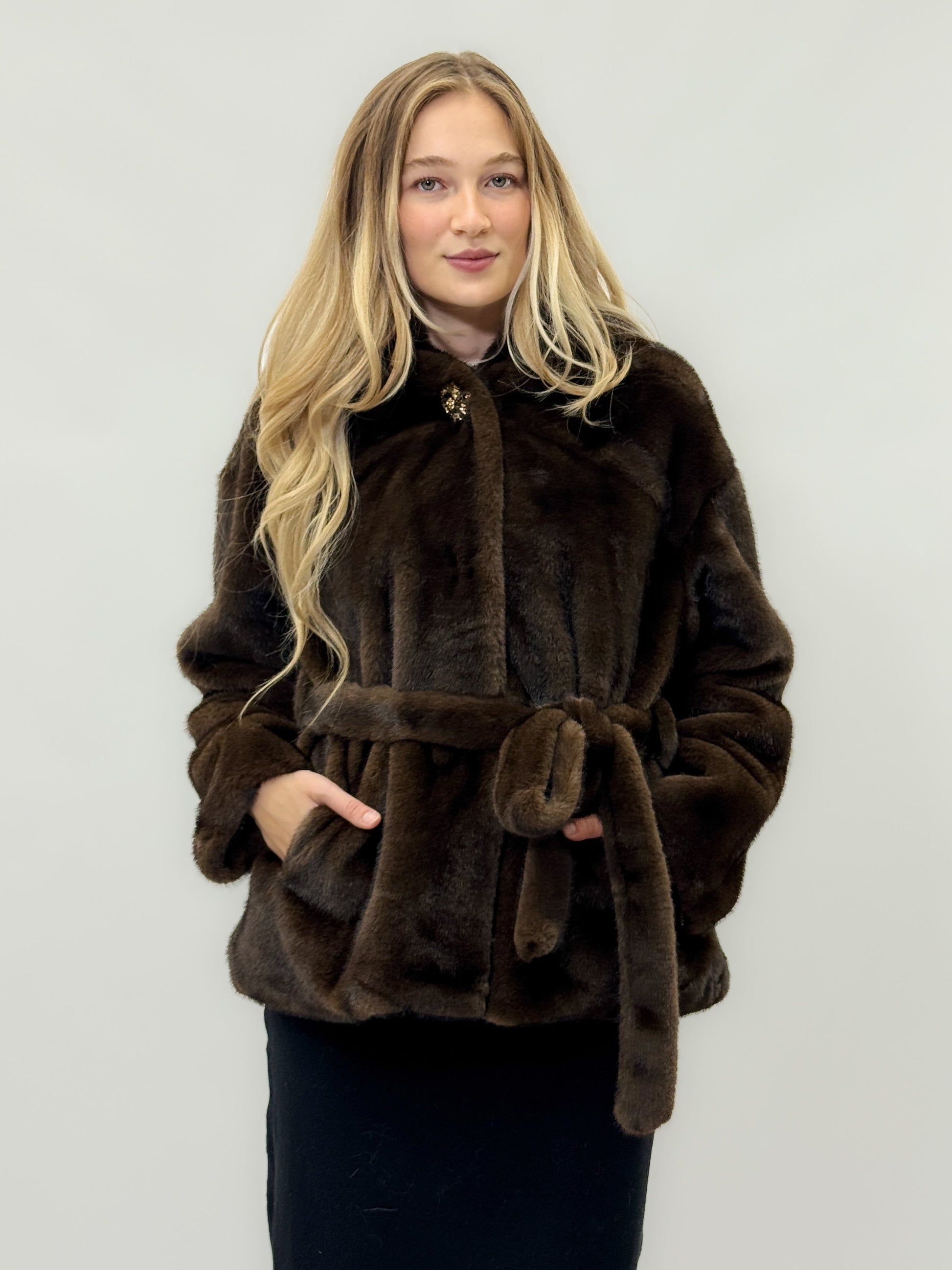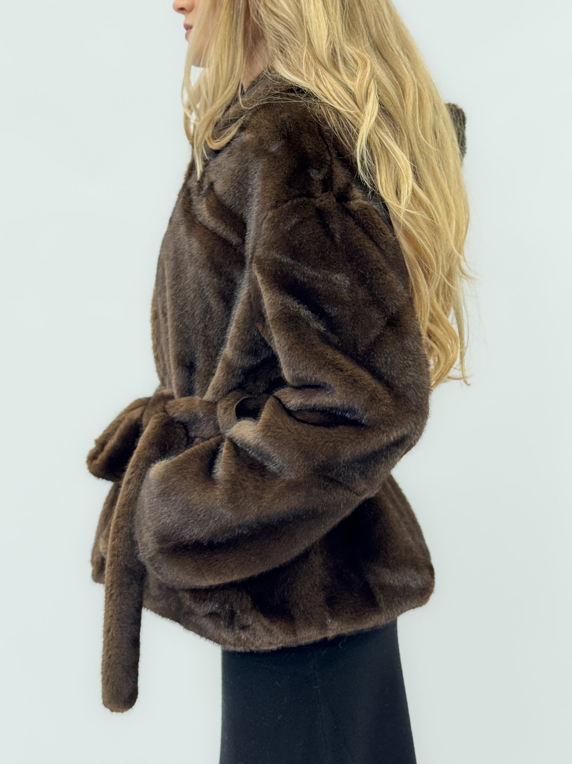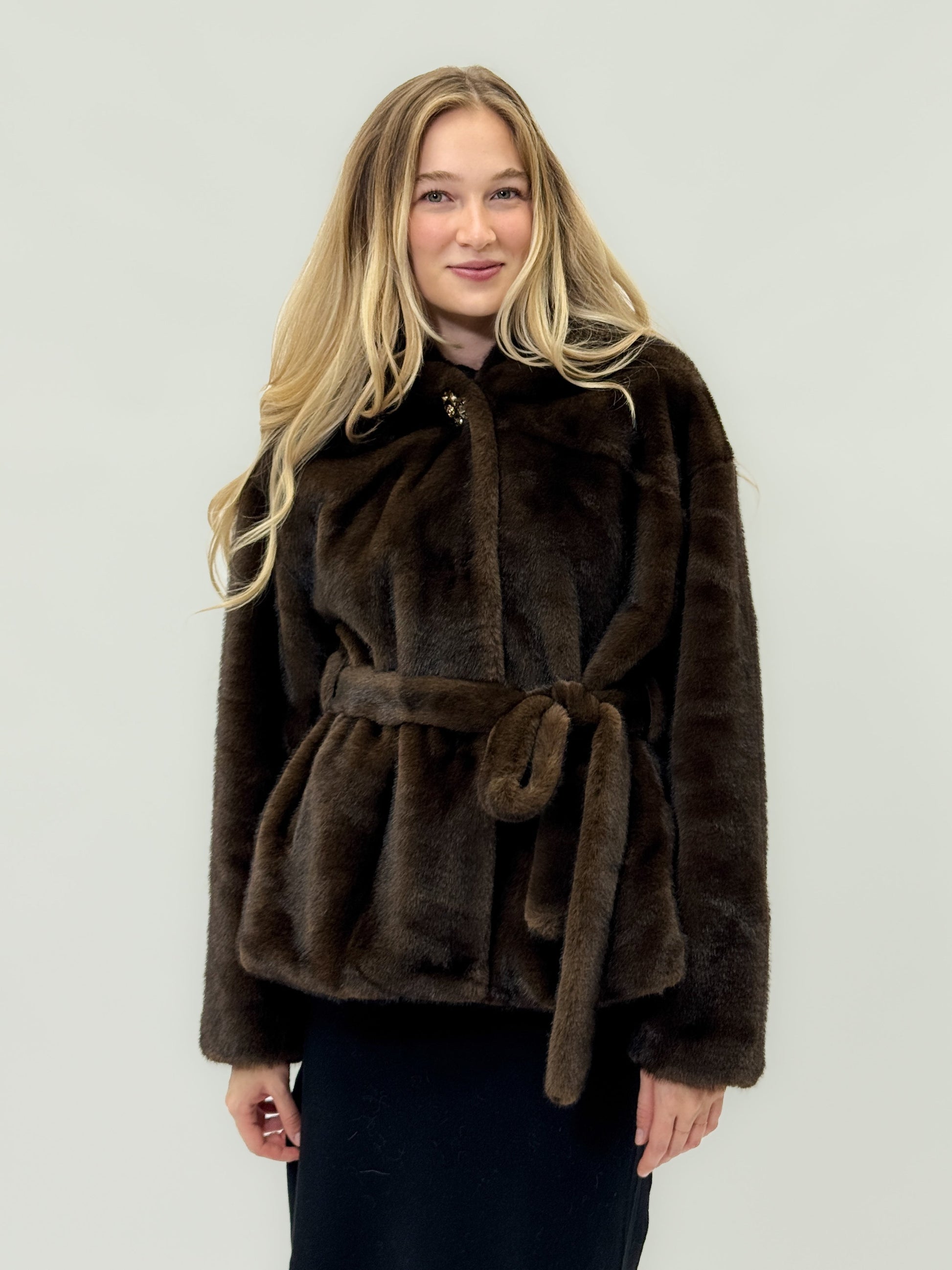 Réalisée en tissu doux effet fourrure, elle offre une sensation chaude et enveloppante au toucher. La ceinture à la taille met en valeur la silhouette, tandis que le bouton bijou au col ajoute une touche de lumière et de raffinement.