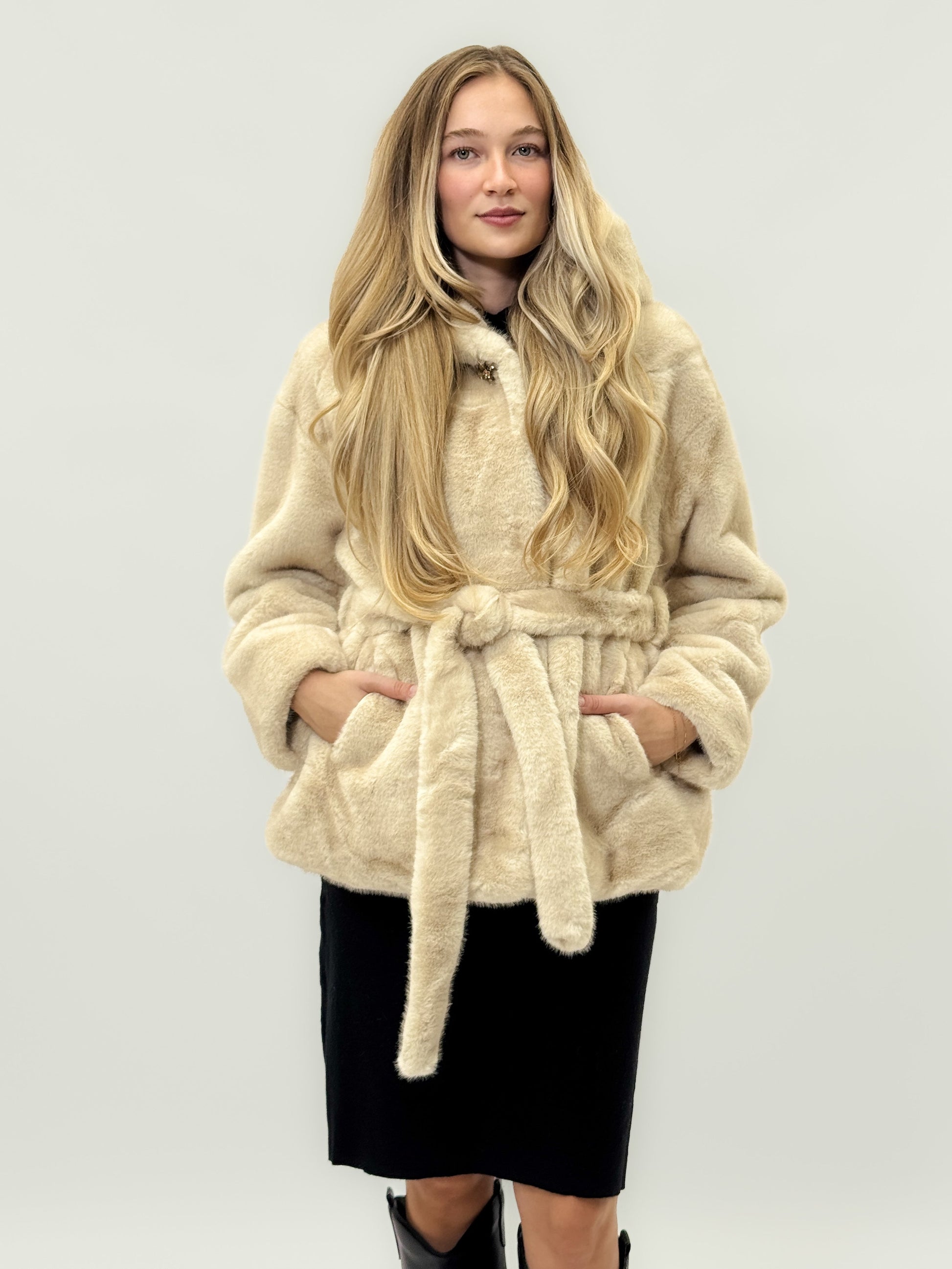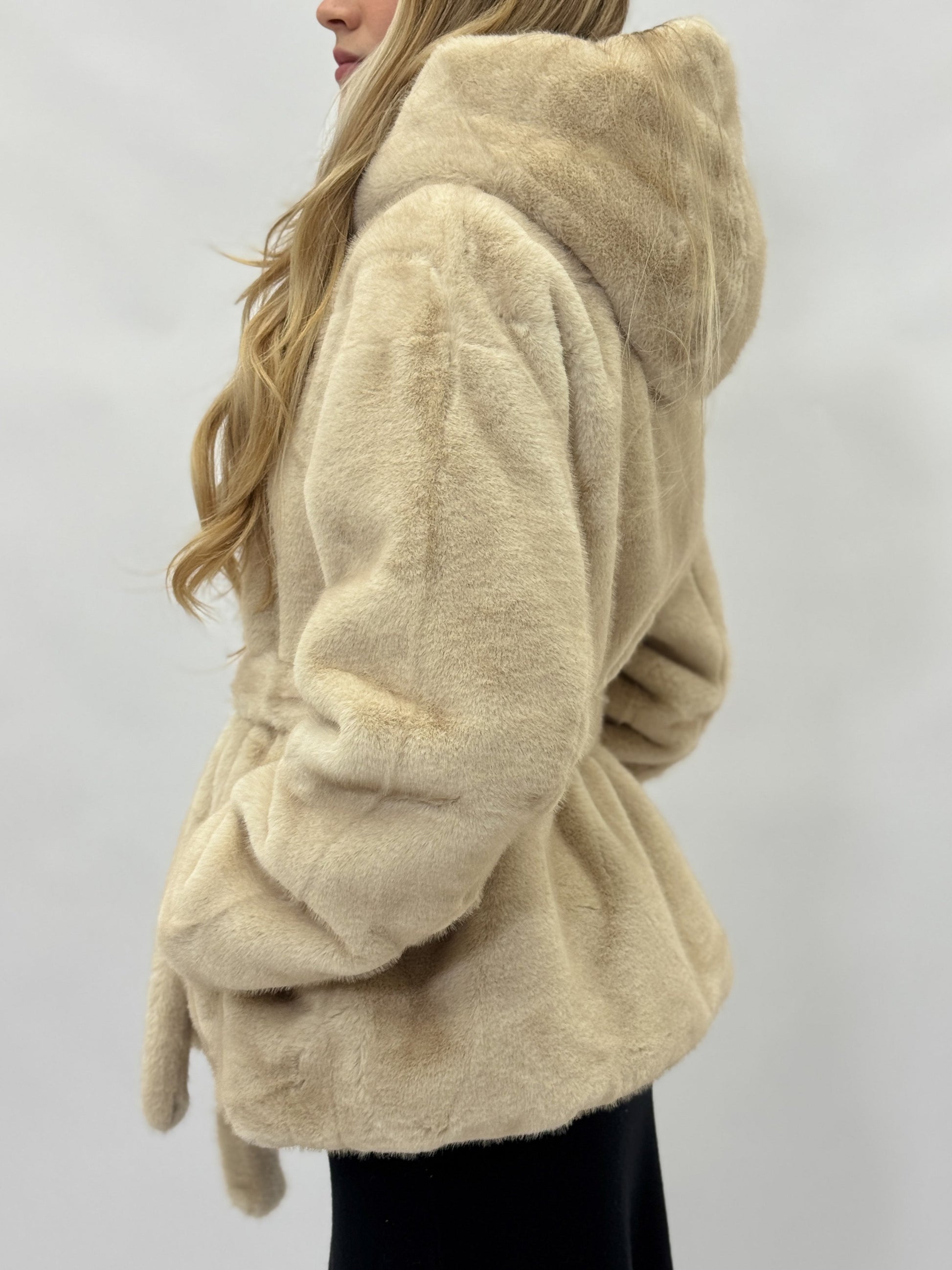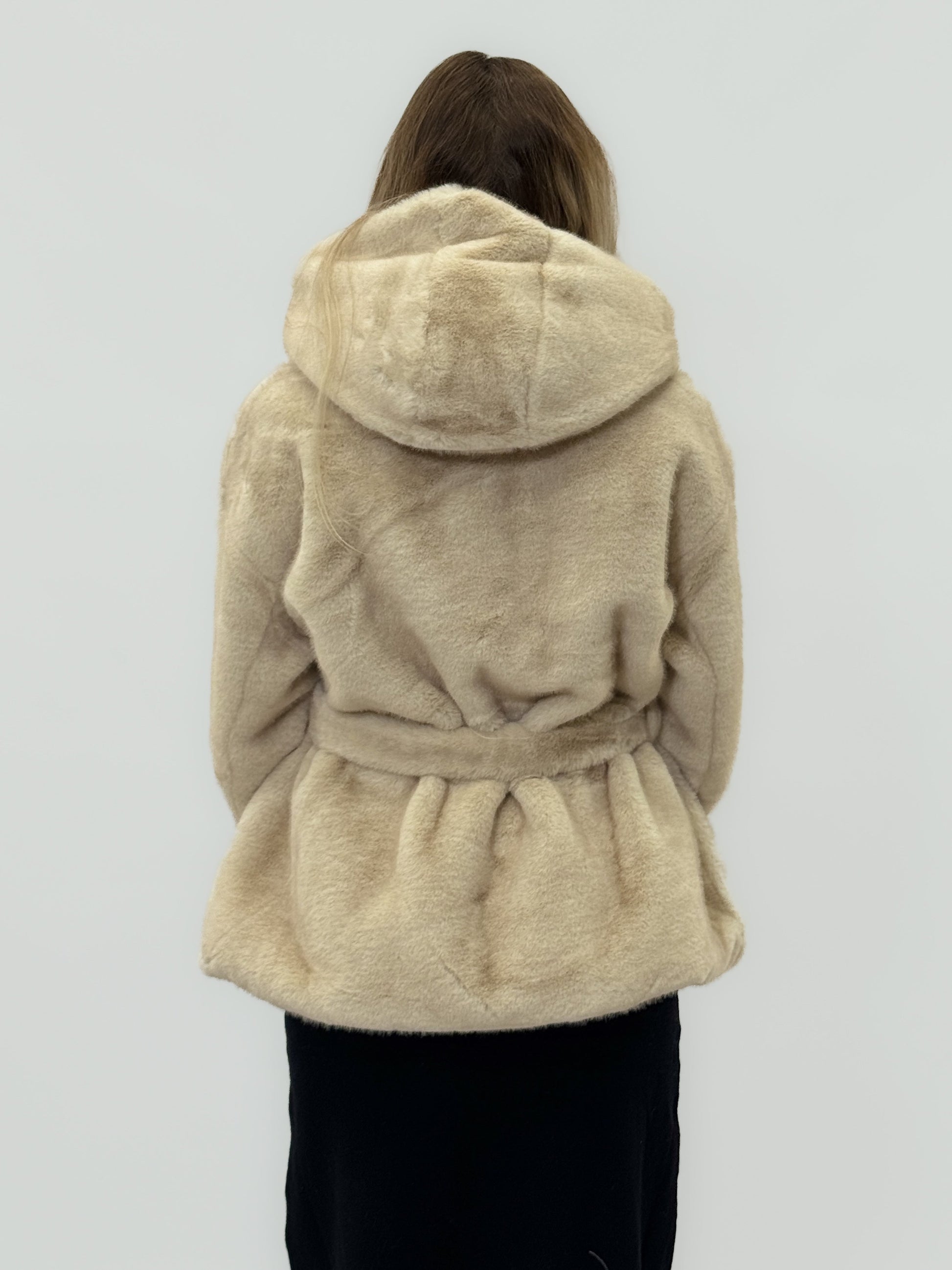 Réalisée en tissu doux effet fourrure, elle offre une sensation chaude et enveloppante au toucher. La ceinture à la taille met en valeur la silhouette, tandis que le bouton bijou au col ajoute une touche de lumière et de raffinement.