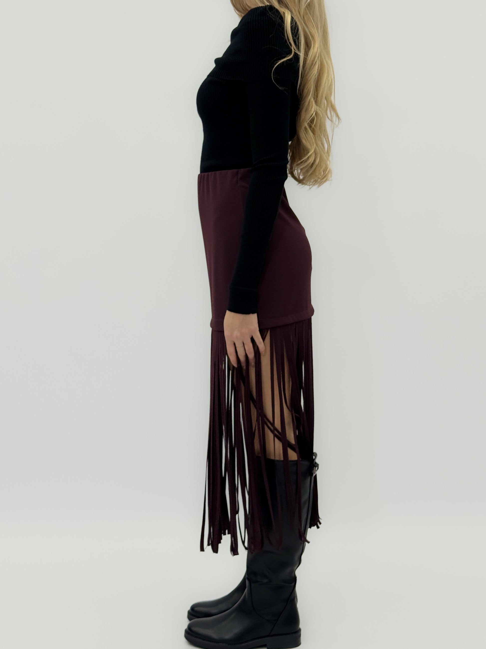 Jupe midi à coupe droite avec des franges longues qui apportent du mouvement et une touche audacieuse à chaque pas. Le design minimaliste en haut se combine avec le bas à franges pour un look moderne et sophistiqué, idéal aussi bien avec des bottes qu'avec des escarpins.