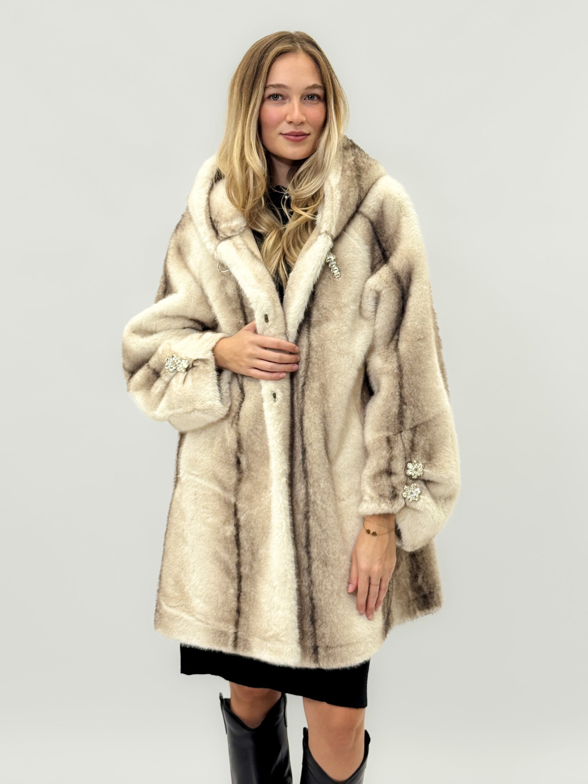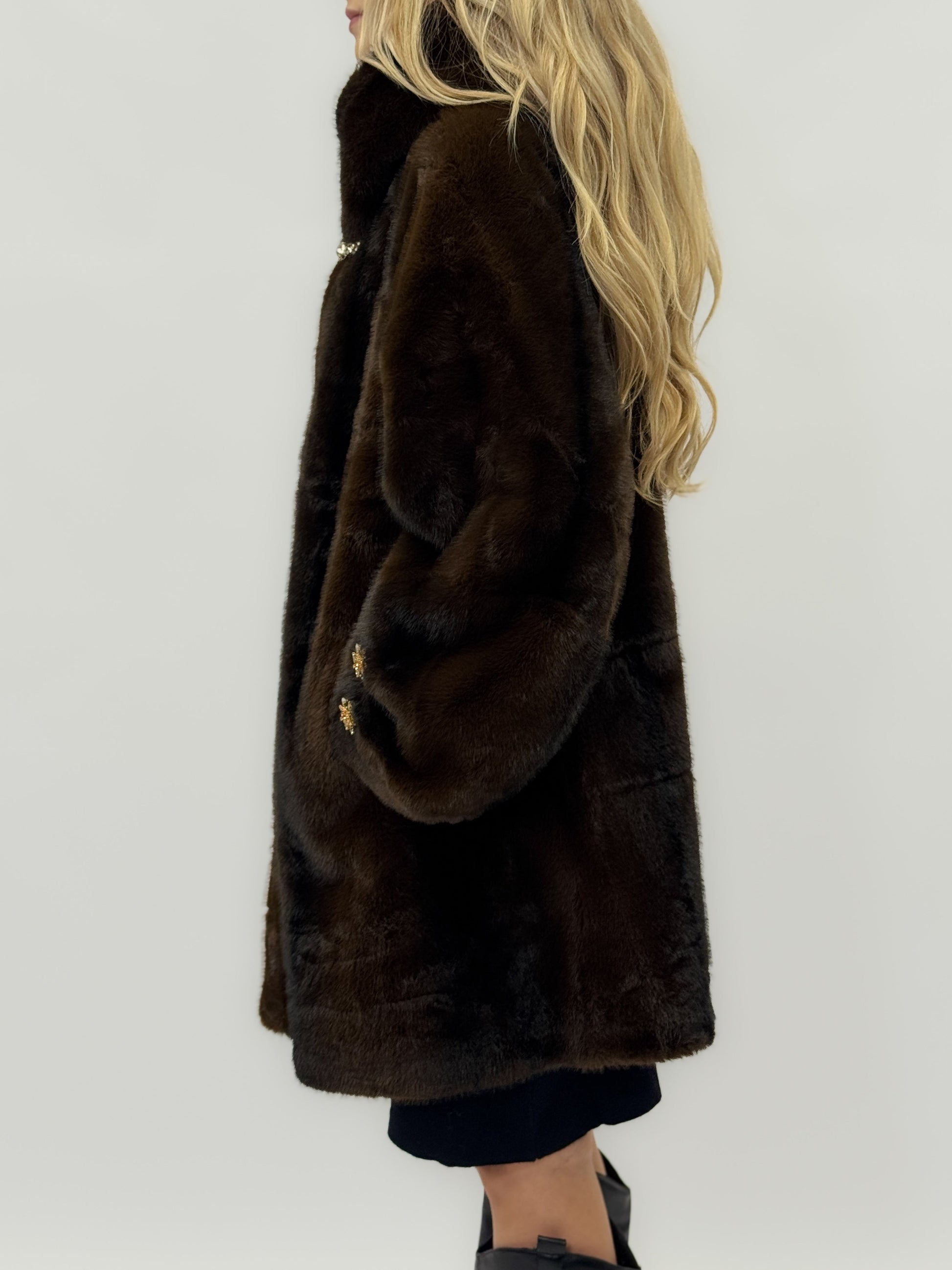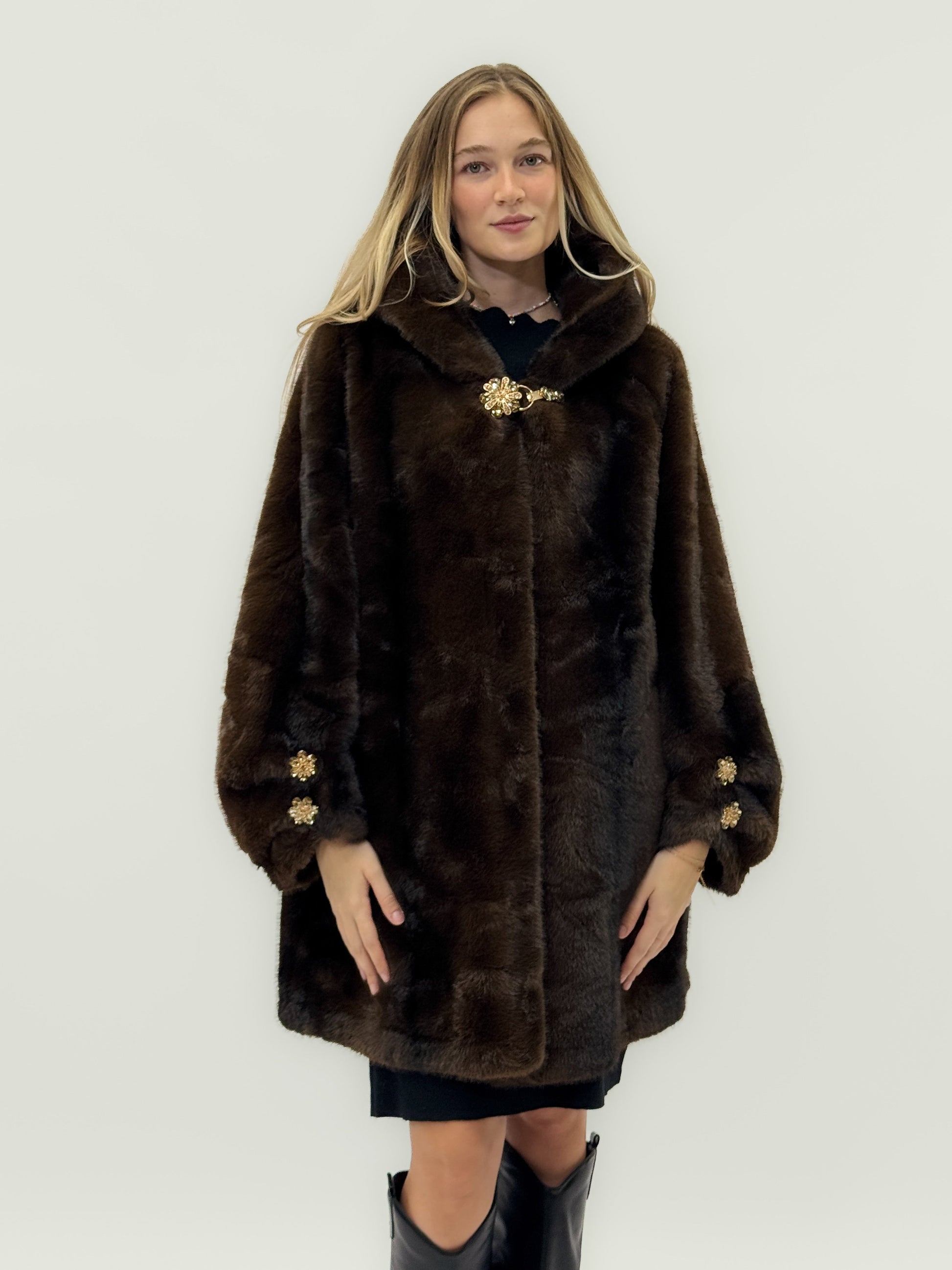 Enveloppante et raffinée, cette pelliccia synthétique est le vêtement parfait pour apporter élégance et chaleur aux looks d'hiver. Réalisée en douce éco-fourrure au toucher velouté, elle présente des manches amples et des détails précieux tels que les fermetures bijoux qui illuminent l'ensemble du vêtement.