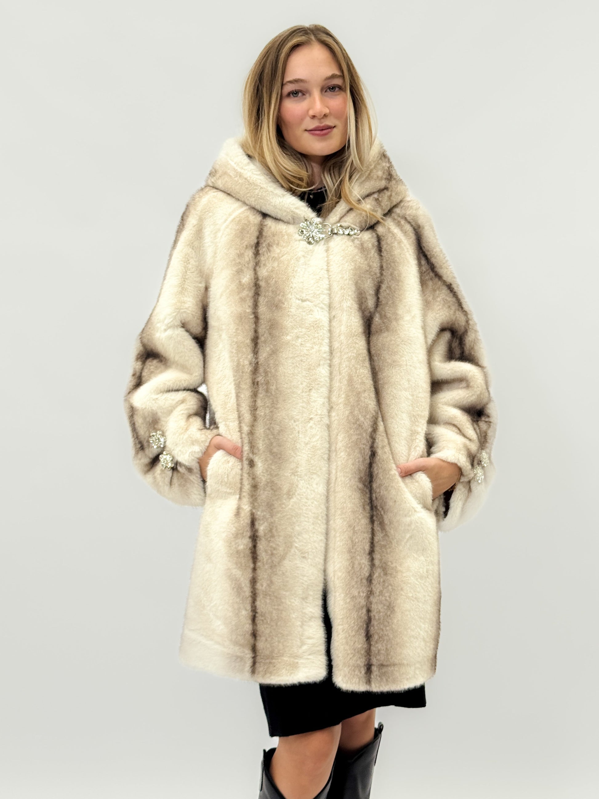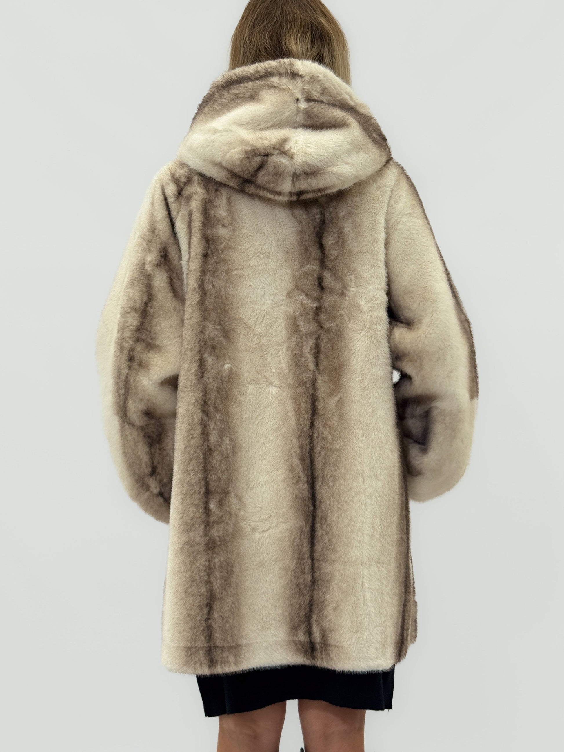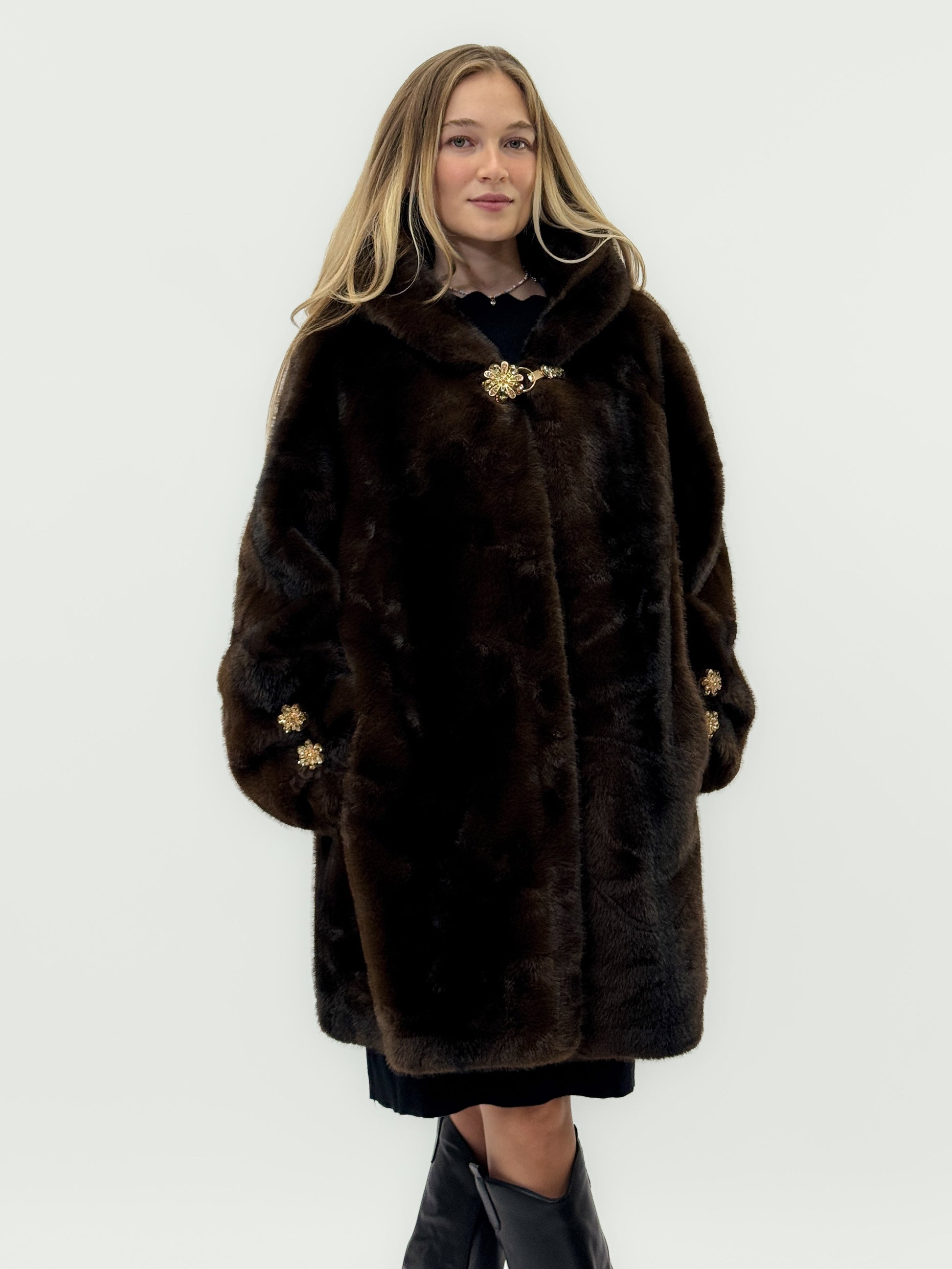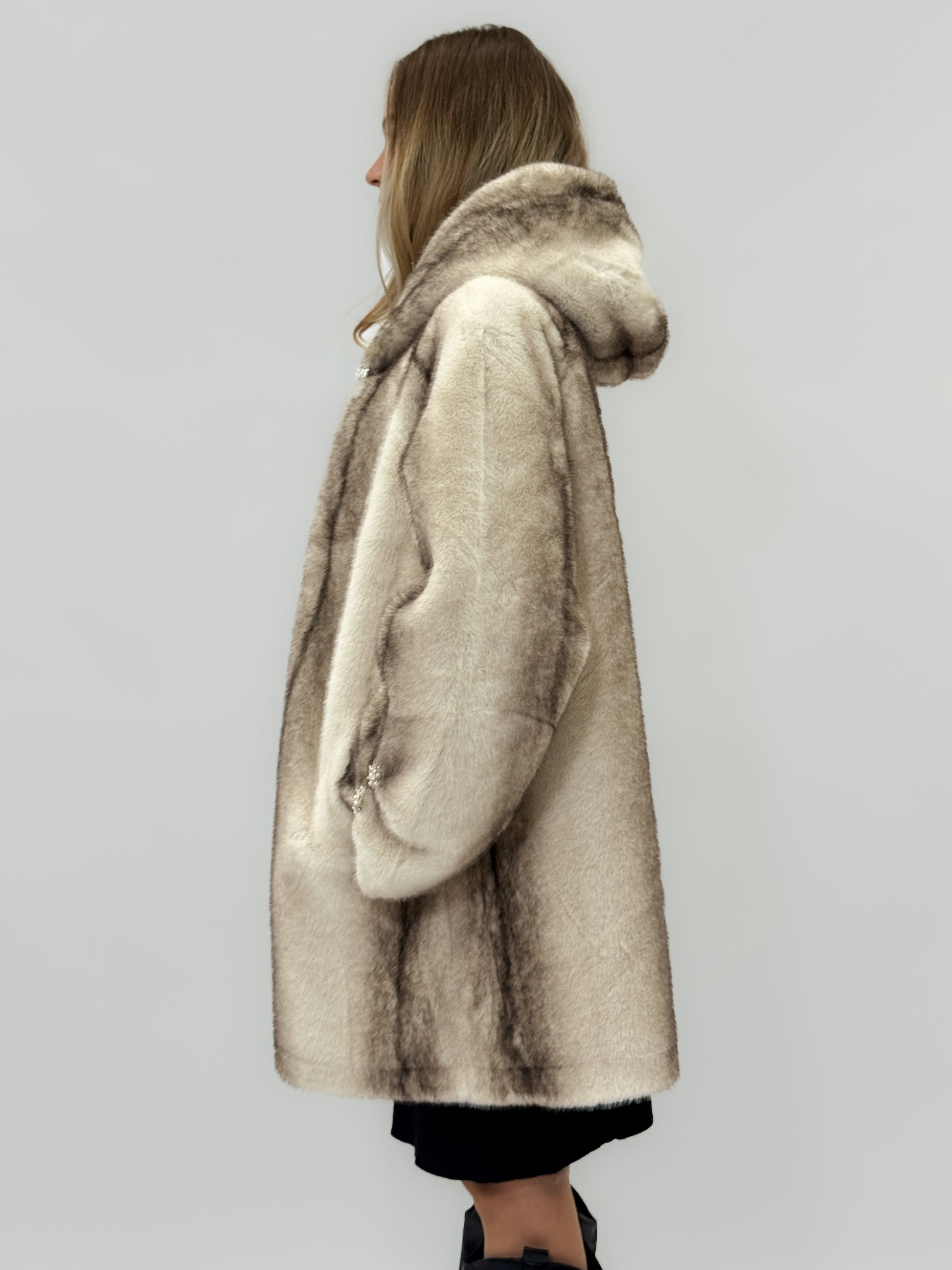 Enveloppante et raffinée, cette pelliccia synthétique est le vêtement parfait pour apporter élégance et chaleur aux looks d'hiver. Réalisée en douce éco-fourrure au toucher velouté, elle présente des manches amples et des détails précieux tels que les fermetures bijoux qui illuminent l'ensemble du vêtement.