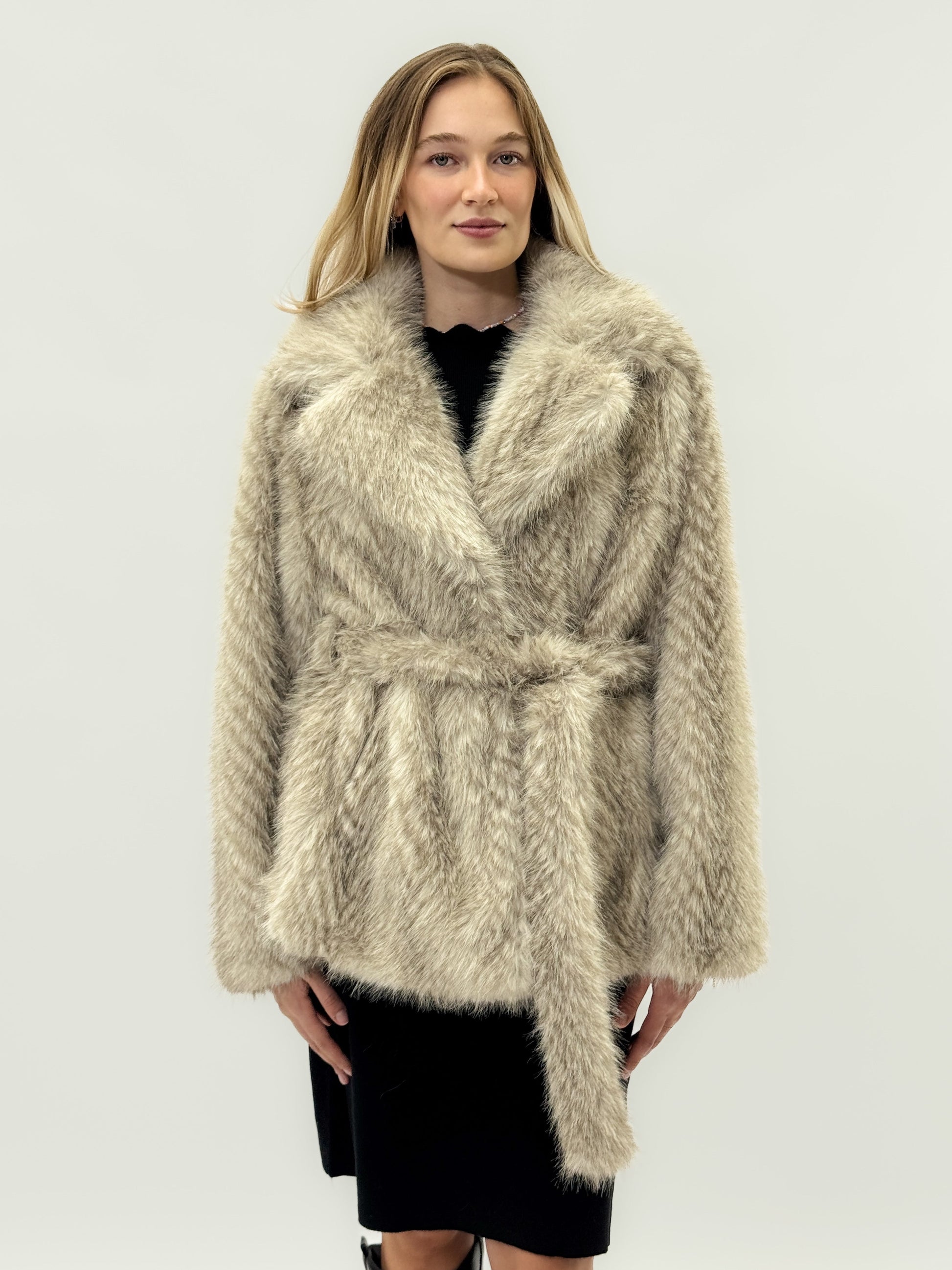 Un vêtement polyvalent et glamour, idéal à associer avec des jeans, des robes ou des pantalons élégants. Réalisée avec des matériaux de haute qualité, c'est le choix idéal pour ceux qui désirent le luxe de la fourrure en version cruelty free.