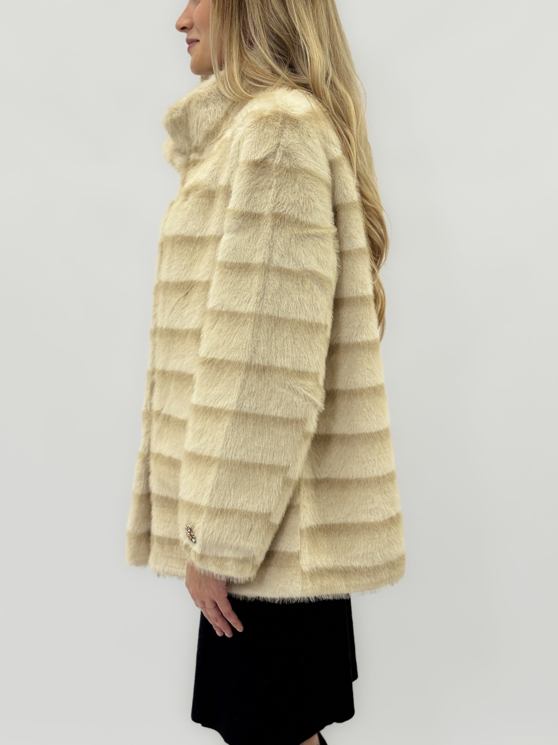 Fausse fourrure écologique au design sophistiqué avec fermeture à boutons bijoux et col montant qui met en valeur le visage avec une touche de classe.
