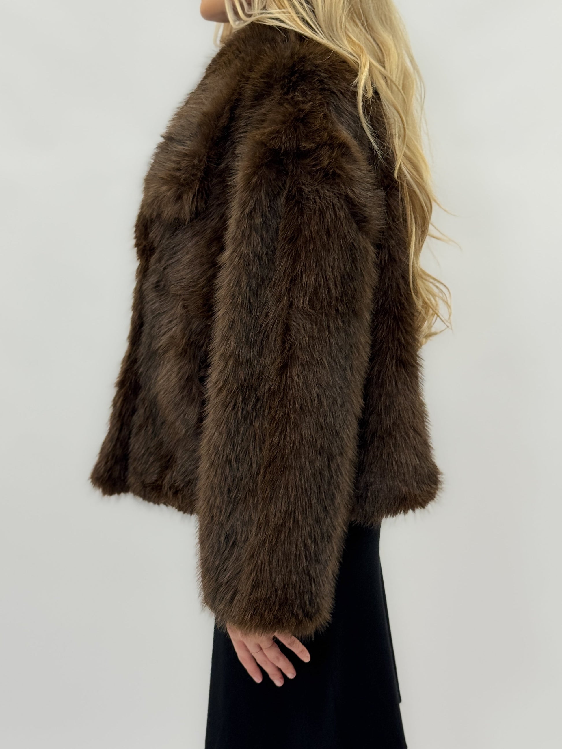 Douce, enveloppante et sophistiquée, cette fausse fourrure courte est le vêtement parfait pour celles qui souhaitent un look élégant et féminin sans renoncer au confort. Réalisée en fausse fourrure écologique de haute qualité, elle présente une coupe moderne avec un grand col et une fermeture frontale cachée, idéale à porter sur des robes élégantes ou avec des looks plus décontractés.